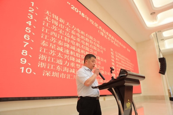 橋機(jī)專委會副理事長單位河南省礦山起重機(jī)有限公司總經(jīng)理任海濤宣布《關(guān)于表彰2018年度優(yōu)秀起重機(jī)配套件供應(yīng)商的決定》并頒發(fā)證書。