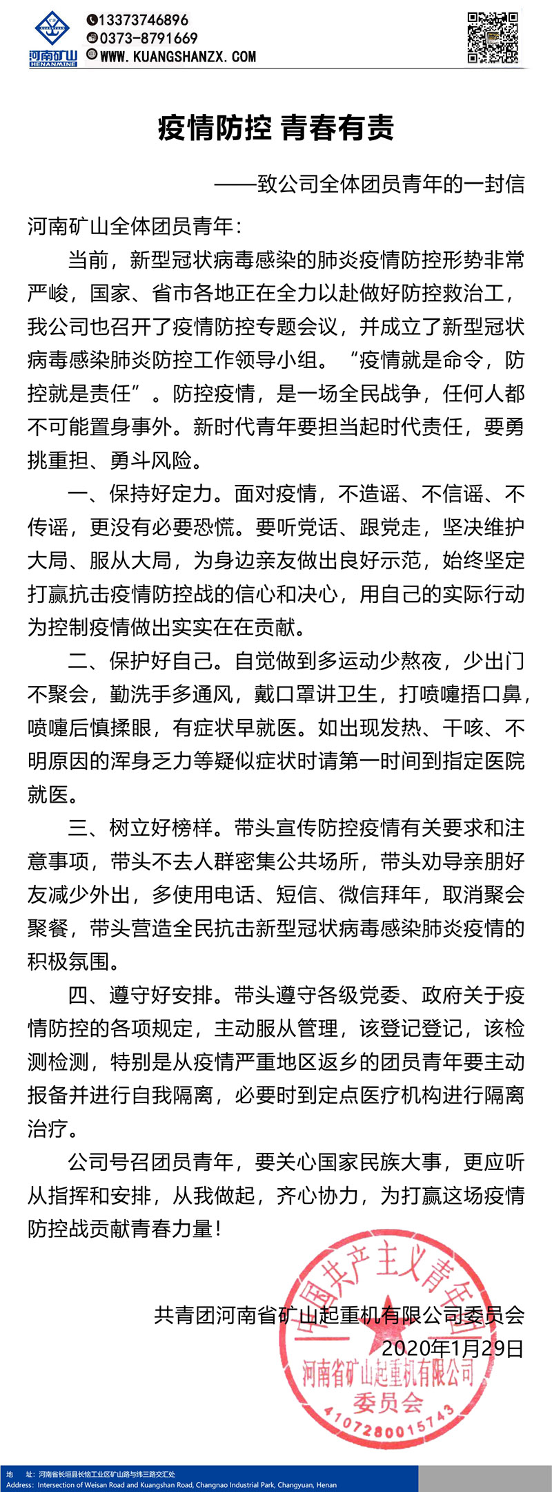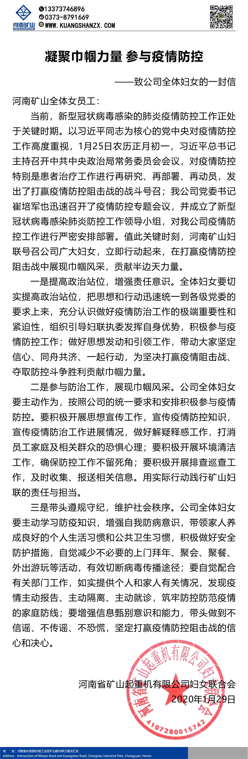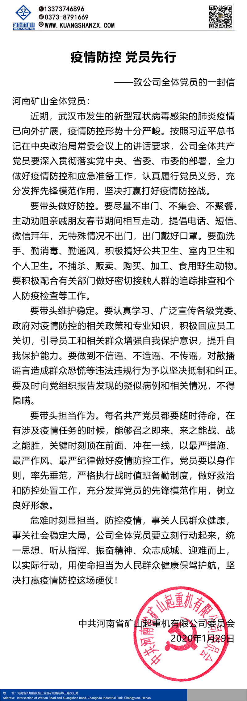 本文相關(guān)關(guān)鍵詞: 河南礦山|致廣大員工的一封信面對(duì)嚴(yán)峻的疫情防控形勢(shì),公司及時(shí)下發(fā)了豫礦文[2020]1號(hào)《關(guān)于防控新型冠狀病毒感染肺炎疫情的通知》,要求全體礦山人深入貫徹落實(shí)習(xí)近平總書(shū)記重要指示精神,按照各級(jí)黨委政府的安排部署,公司黨組織、工會(huì)、團(tuán)委、婦聯(lián)要發(fā)揮宣傳、組織、帶頭、服務(wù)作用,在關(guān)鍵時(shí)候做好員工思想工作,積極響應(yīng)號(hào)召,主動(dòng)擔(dān)當(dāng),充分發(fā)揮先鋒模范作用。