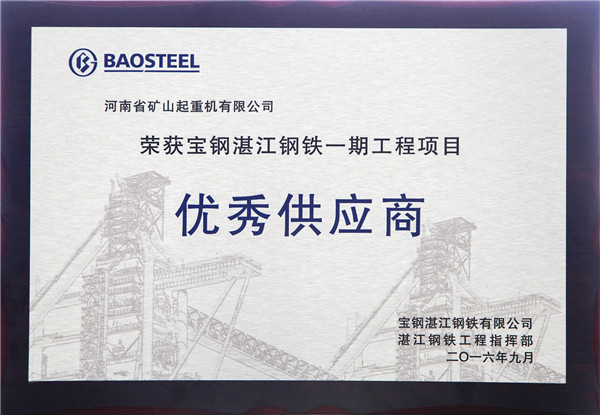 我公司為寶鋼湛江項(xiàng)目承制的起重機(jī)在使用過程中,憑借過硬的產(chǎn)品質(zhì)量榮獲寶鋼湛江鋼鐵一期工程項(xiàng)目“優(yōu)秀供應(yīng)商”榮譽(yù)稱號(hào)。